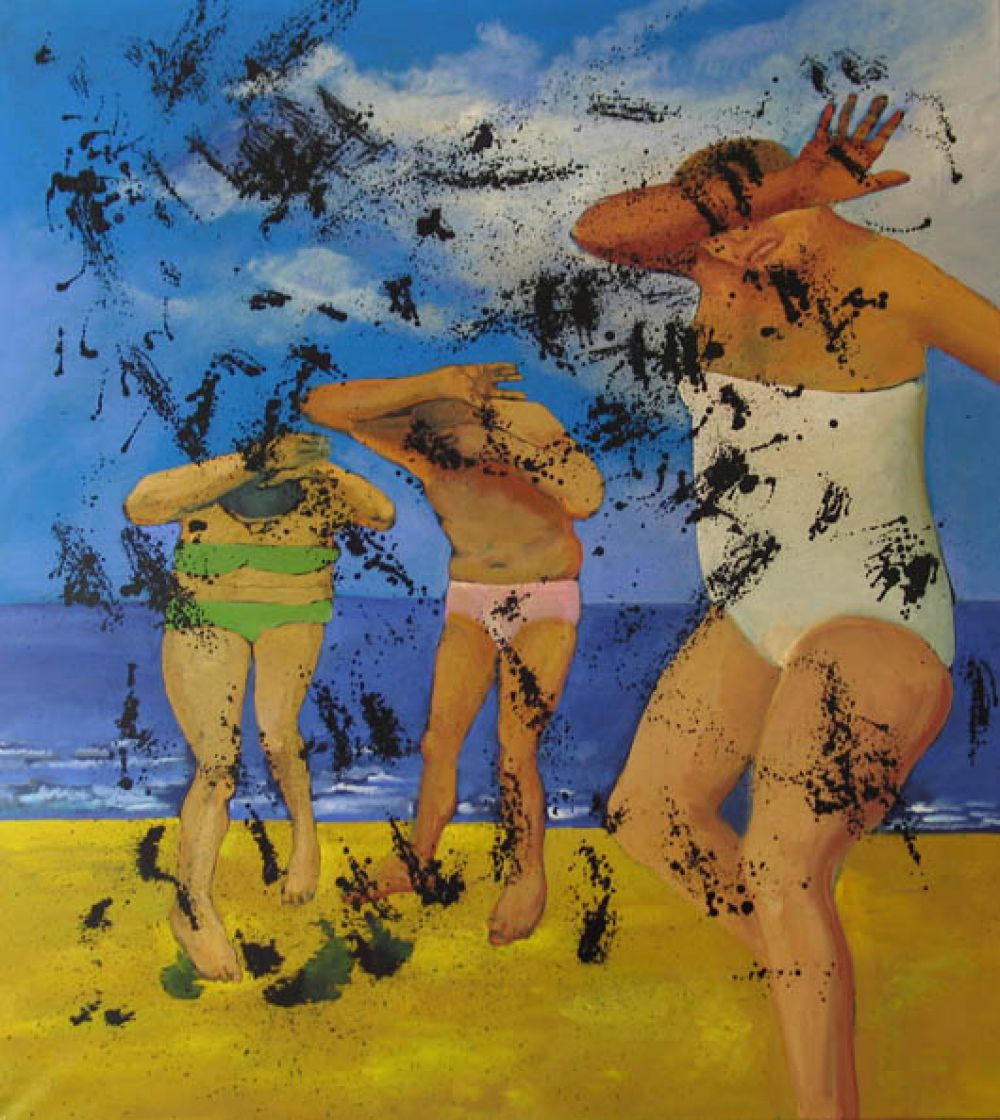 Są trzy aspekty kluczowe dla budowy tej pracy, przy okazji pokazujące moją, mówiąc w cudzysłowie, drogę. Pierwszy aspekt to relacja pomiędzy widzem a malowidłem. Wandalizm. Oglądający jest właściwie zapraszany do udziału w powstaniu płótna. Każdy może wziąć do ręki grudę farby, błota i rzucić w obraz. To działanie , na granicy performansu, nie umniejszy znaczenia dzieła i nie pohańbi aktu twórczego. Nawet chętnie oddałbym obraz we władanie widzów i pozwolił na obrzucanie, ale, zapewne po kilku oglądająco –rzucających, stałby się niewidoczny zupełnie, zapaćkany. Chcąc pokazać pracę raz jeszcze i jeszcze, musiałbym za każdym razem malować obraz na nowo. Performatywność w moim wykonaniu ma jednak granice… Nie chciałoby mi się malować , znowu i znowu, tego samego. Drugi aspekt to oczywista relacja pomiędzy namalowanymi postaciami a spadającym na nich panoptykalnym, czarnym deszczem. Nie tylko z rzeczywistości obrazu ale i spoza obrazu!! Są tu odniesienia oczywiste biblijno- ekologiczne, od wygnania z raju, przez plagi egipskie po zagrożenie, płynące z nieba ( i prawdziwe i symboliczne ). Czym straszeni jesteśmy codziennie i czego codziennie doświadczamy. Trzecia sprawa, trzeci aspekt, to relacja pomiędzy mną - artystą , którego genotyp leży w grafice a prawdziwym ,w cudzysłowie, malarstwem. Myślenie graficzne, za którym stoi chęć przekazu, nawet moralizatorstwa, potrzeba ambitnego opisu świata, kiedyś przynależało tylko sztukom graficznym. Malarstwo nie mogło być w takim sensie graficzne, a już narracyjne! Miało być po prostu malarskie. Takie postawy, częste u akademików, są mi odległe. Choć muszę przyznać, że odcinanie pępowiny przyzwyczajeń i szkolnych wpływów, nie przychodzi łatwo. W „Czarnym deszczu” użyłem sposobu malowania , który Francuzi nazywają peinture mauvais - złym malarstwem. Duffy, Buffet, może Guttuso , którym się udało —parasolki, sceny plażowe, kolorowe stragany i niebieskie niebo. Gdyby nie format obrazu, powiedziałbym , że nawet bardzo złym malarstwem. Wymiary ratują ! Otóż to malarstwo zaatakowane jest graficznie, przez czarny tusz, farbę graficzną. Dopiero na styku graficzności i malarskości powstaje wartość. I w wymiarze plastycznym i znaczeniowym. Czy to nie jest klucz do mojej pracy ? Stąd jego obecność na okładce katalogu wystawy w Muzeum Narodowym w Krakowie i na plakacie do ekspozycji. *Zmodyfikowana wypowiedź z filmu „Dziennik obserwatora”