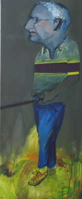 Obraz Jacka Sroki z 1996 roku przedstawia Powieszonego - człowieka w towarzystwie dwu psów. Wiszą oni do góry nogami (nasuwa się skojarzenie z Baselitzem) w drewnianej konstrukcji, tworzącej także optyczne obramienie całej kompozycji. W tle znajdują się wizerunki drobnych, ostrych narzędzi z drewnianymi rękojeściami. Ostrza tychże narzędzi skierowane są również do dołu, co podkreśla ogólną ideę tego obrazu. Tonacja kolorystyczna opiera się na dominacji zimnego błękitu ultramarynowego, przechodzącego bądź w fiolet, bądź w zieleń. Jasny drugi plan kontrastuje silnie z ciemnymi, tajemniczymi postaciami.